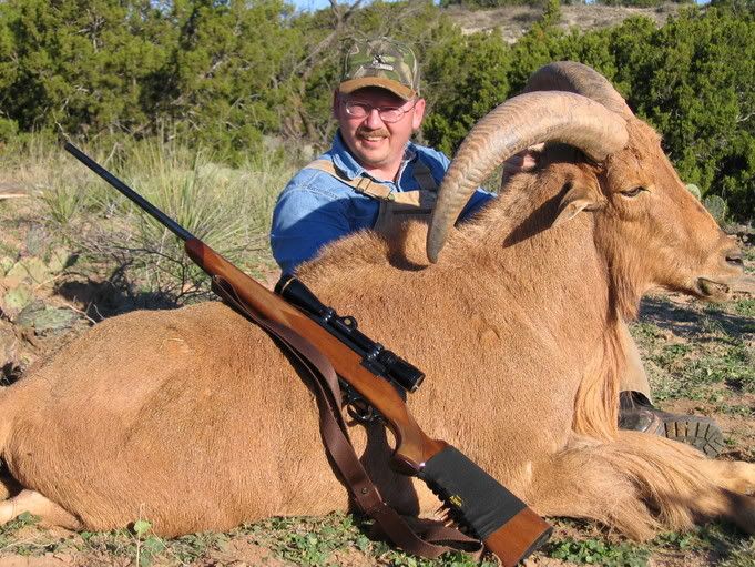 The next day we hunted in the same area. We found 4 different groups of aoudads, well over a hundred together. And, we stalked within 200yrds of many of them. The only problem was they were all ewe's and lambs. And, I was after a big ram for the office. So, I passed on them all. Then, in the afternoon we decided to call some in. That's right, I said call them in. My rancher friend told us to use our predator calls and it would call in the aoudads. I didn't believe him. But, that afternoon we tried it anyway. And, to our surprise, after we made a few calls on the predator call out popped two aoudads. They were both ewe's. But, there was only one day left to hunt so I decided to take the larger ewe. We stalked within about 150yrds and I let it rip. I knew as soon as I made the shot it was a bad one. So, I put another one in her. We didn't see her drop. But, the younger ewe was just standing by some cedars. So, we figured she was there. She was too. But, she was still alive. Since KP was between me and her he put the finishing shot in her. All in all a nice ewe.