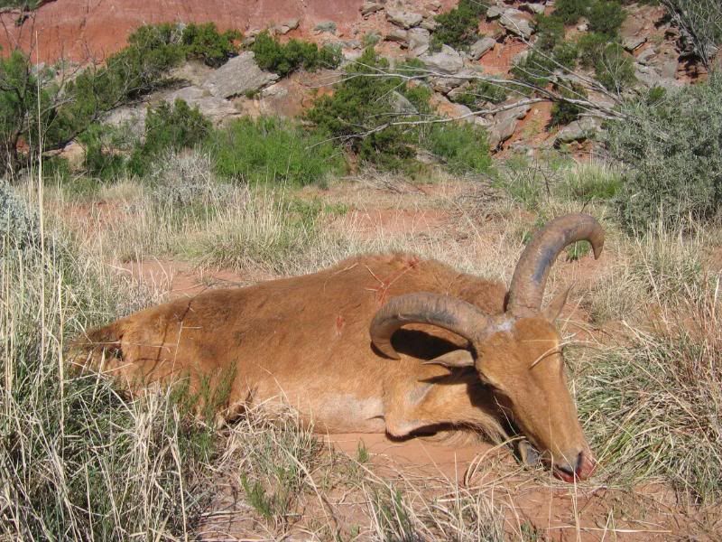 After branding KP and I went out to do some aoudad hunting. The first area we went was an old reliable spot. We found a group of aoudad feeding back in a canyon about a half mile away. We stalked up to a finger on the plateau where I felt the aoudad would come up on. And, they did. We got within about 75yrds of them. KP shot a nice ewe. I had an opportunity at one, but decided to wait because I didn't know how difficult a recovery job we'd have on KP's. Recovery wasn't too bad though.