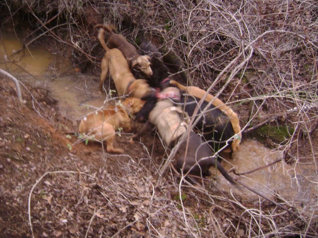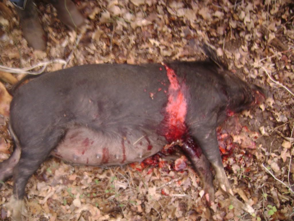 Hooked up with some buds to make a quick hunt before the rain came.. Turned dogs out and had a bay within 3 min.. Killed a sow and dogs rolled out by that time it started sleeting so we head back to the truck and it stops.. So we go to another set of woods.. Dogs working around 250 yards for like 10 min and ike lets out a nice lil prick bawl as jay calls it lol.. then the music started playing as we get closer it breaks and heads strait for the creek.. lol im like rock paper scissors to see who goes in  cuz man its cold.. They ended up catching the lil sow.. We figured it was an good pup trainer so we took her to the house. first sow  I kno the fellas cold
