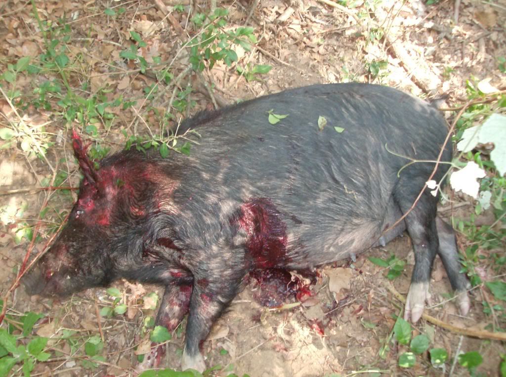 Jay and I made this evening. I loaded boone,ike,sue,and hank and cds red,kujo. Hit one set of woods dogs checked it out pretty good but nothin. Decided to move across the way to another set of woods and dogs were out but jus stayed in one area for awhile then finally boone opens up. This is the first hog ive cught in a long tym that bayed up good usually they run like deer around my way. Anyway send the bulldogs and there we have this nice boar jus waiting for us to leg him  ,