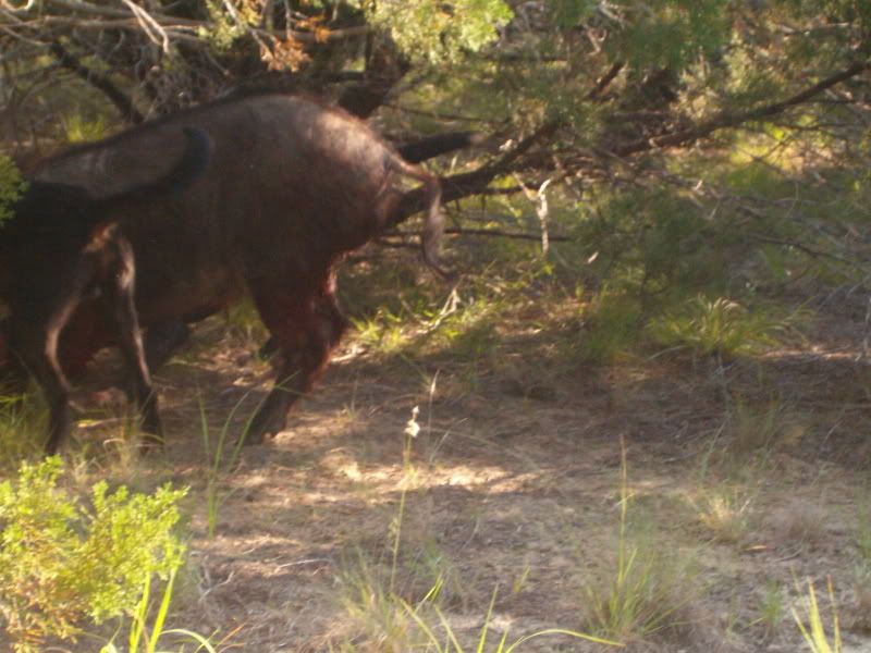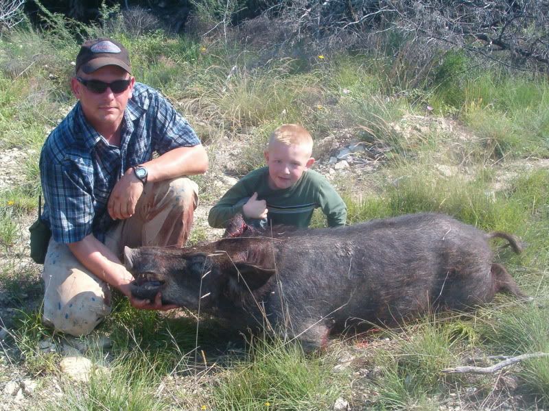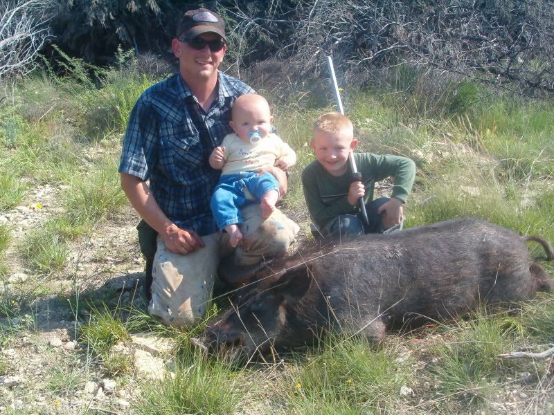 I took my wife and boys out on memorial day morning to see if we could get on a hog before it got too hot. We made a couple turnouts with no luck so I decided to stop by a tank and let the dogs cool off and get a drink and maybe hit some sign while we were there. We kicked the strike dogs out at the tank and two of them swam straight across and disappeared into the trees on the other side. We waited for a while and I decided my new pit pup could use a swim so we let her out of the box to cool off and get some exposure to water. I had lost all three strike dogs on the garmin so I was walking up the hill back to the pickup when it picked up my old Betty dog and showed her treed at six hundred yards, so we loaded up the pup and drove as close to the bay as we could. We got to within about a hundred and fifty yards with the pickup and could hear the dogs baying, so we unloaded Beetle, the catch dog that we are borrowing for a while (thanks Cody!) and my oldest boy, Cason and I headed in to the dogs while Erin stayed at the pickup with the youngest one, Eastin. We got there and the dogs had a nice boar bayed in the cedars. I had hoped to get a picture of the bay but the stupid camera wouldn't focus fast enough to let me so I cut Beetle loose and she got him caught after a little struggle. I tried again to get a picture as she was catching but everything was moving too fast for our old camera so all I got was tail ends. I legged and stuck the hog and got all the dogs back out to pickup, then went back for the boar. We took a few pictures, got him gutted and called it a day. Hog weighed right at 150 gutted so I guess he would have gone two hundred or a little less on the hoof? Had a good time with the family, Cason is really liking the hog hunting, especially now that he has claimed one of my strike dogs. Of course it was his Blue dog that found the hog, at least according to him. Here's some pictures. My sorry excuse for an action picture. Hog moved faster than the camera.  Cason and me with the hog  Me, Eastin, and Cason  another one with all of us, and our catahoula, Betty