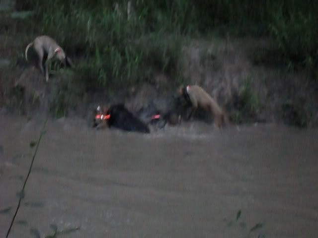 Turned out this morning around 6 at my buddies farm on the White Oak creek. We rode the bottoms and bayed up a good little boar. My saddle back gyp was chasing another hog towards the creek while my kemmer cur and my new yellar cur had the boar bayed in a fallen oak tree. We watch the bay for a little bit, and then send in the bulldog who just came off of injured reserve. He jumps off of the tree to far over the hog and misses. He breaks and goes about 600 yards and they finally catch him across the creek. The creek has a really good current running in it, and pushes my skinny butt about 40 yards down stream from the dogs before i finally get to the other side.  Cheesy I leg the hog, but he drowns before i can pull myself and him onto the bank. Tried to take a few videos of the first bay and the catch/ me diving in the creek but the stupid camera didnt want to work right.  Angry