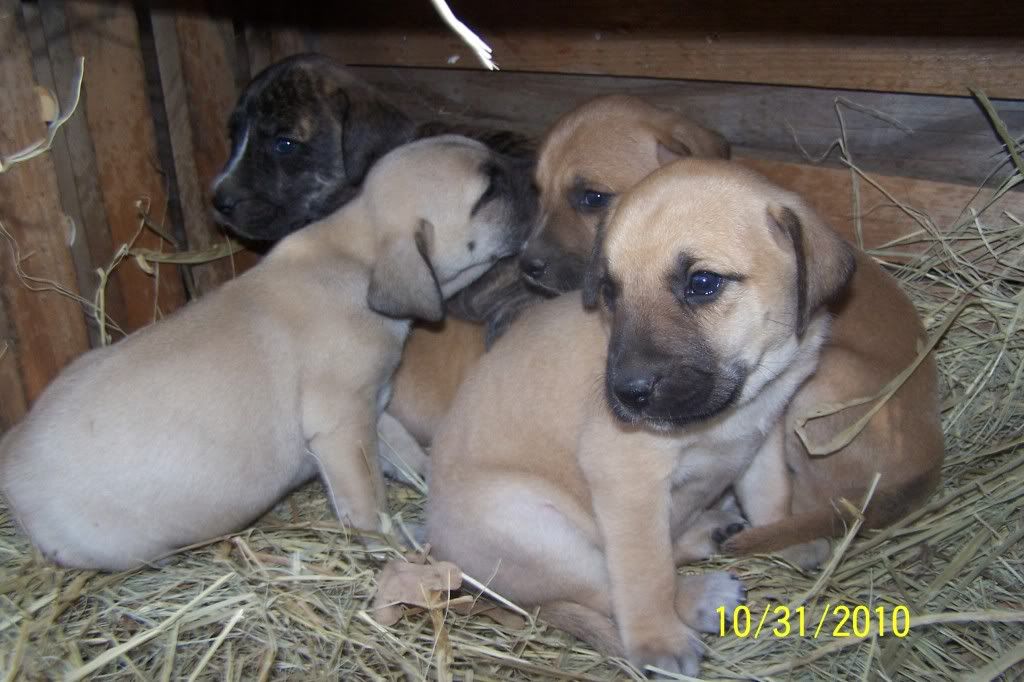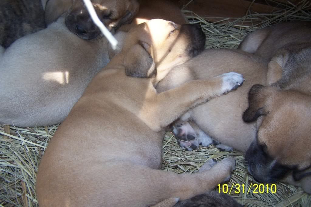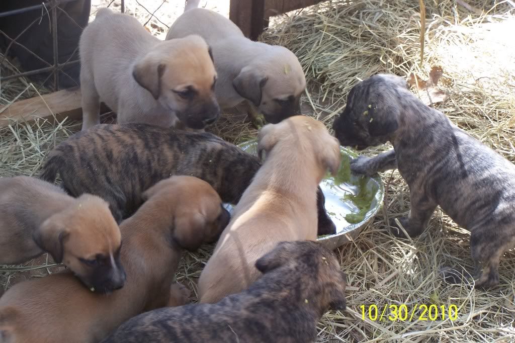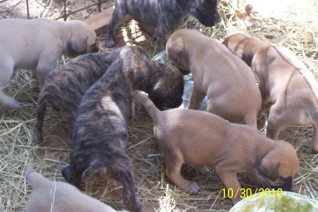 The pups turned a month old this Saturday and they are doing good. They were wormed for the first time this weekend and they have an appointment with the vet on November 13th to get a ckeckup their first round of shots. This means they will be ready to go on the 14th. We started them on peas, carrots and Gerber rice cereal this weekend and they are loving it. They aren't weaned yet, we are just giving this in addition. They are some very healthy pups so far.