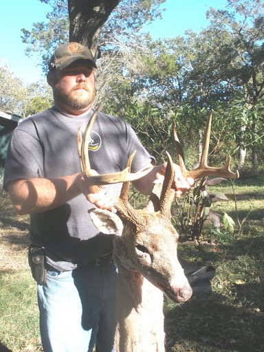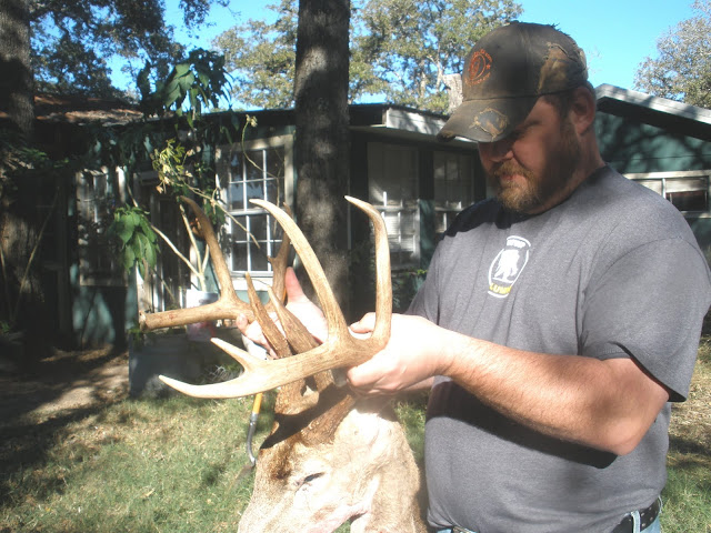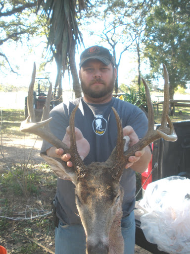 Ron, DC, and myself were drawn for a bow, muzzle loader or shotgun hunt in Edna. After check in, we drew for stands. I shot a doe the first afternoon while DC and Ron slept. The next morning I saw two exceptional bucks but could not tell spread until they were out of shooting lane. Ron shot a doe and DC slept at the pavillion woke up ate pop tarts then took a siesta. Went out that afternoon saw this buck and a great 12 that I could not get a shot at. Shot this deer once again while Ron slept and DC was playing Volleyball by the pavillion. The next morning since I limited out everyone drew for my stand. My hunting buddies drew the stand and opted to hunt together. They saw two of the bucks I had seen but could not shoot then one of them missed a 27 yard shot at a doe with the same gun I had shot both of mine with. We loaded up and the other member that was not Ron went with him to Goliad where he missed a hog that afternoon. I was told that the guns he borrowed had screws missing on the scope rings and the barrels were bent.