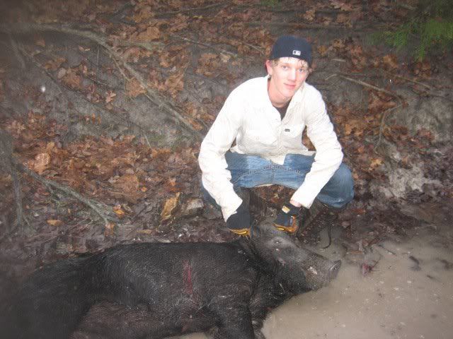 We made a run Saturday morning hoping to get in and out of the woods before the rain started. Well, the light steady drizzle started soon as we opened the gate to the place and didn't let up for the rest of the day. Anyways, where we hunted, we have to drive through a neighbors place, and the side where the places meet has no gate and is net wired so we have to chunk dogs over to hunt. We collared up strike dogs and started placing them over the fence and before we got the last dog over, my buddies dog Benny was already baying about 300 yards in the woods, so we hurried over the fence and walked up to a group of about 10-15 rallying hogs and sent in the CDs. Got a good sow right off the bat, and all dogs had rolled out so we headed in their direction. Got out of the woods into a lane and could hear another bay and tracker showed all dogs treed at 800 yards. Got to them, sent in CDs, and ended up with a little sow about 75lbs, and dogs had rolled out again. We could already hear baying as we were getting the CDs off, so hustled to them and dogs had a nice boar bayed in a creek. After dispatching that hog we got the hog out of the creek and took a little breather and tried to check dogs because we heard a dog get hit on the way there. All dogs were fine, but one dog, Slick had rolled out again, and opened up 5-600 yards out, so we headed his way. By the time we get there all 5 dogs are hammering on a pretty good sized boar but we were on opposite sides of a really steep creek bank and we didn't want to let the CDs go and not be able to make it up the bank, so we tried to slip around and find a spot to get the CDs across the creek. Meanwhile Keegan got a little video footage of the dogs baying, but before we could get across the hog broke. The dogs stopped him a couple times, but we could never get to them in time. He must have ran the dogs through another group of sows because by the time we got to the final bay it was a 100lb sow  . By this time we were all soaking wet and pretty worn out, and decided to leash strike dogs up and call it a day. Ended up with 4 hogs in about an hour, First sow weighed 242lbs and the Boar weighed 191lbs. How big do ya'll think the Boar in the video is?? First Sow:  Cole w/ Boar  Keegan, Brooke with the day's Catch  Video: http://www.youtube.com/watch?v=SV3_Iee25r0