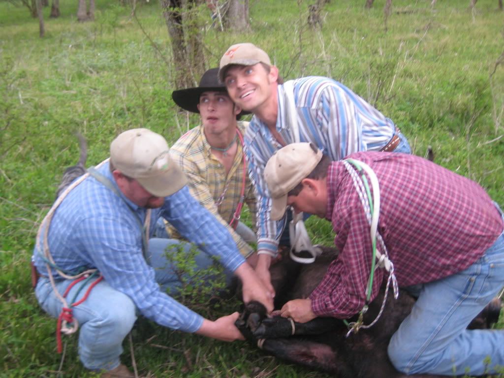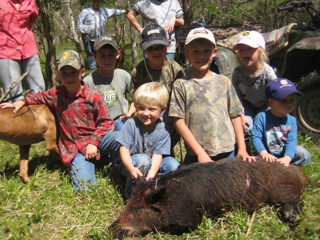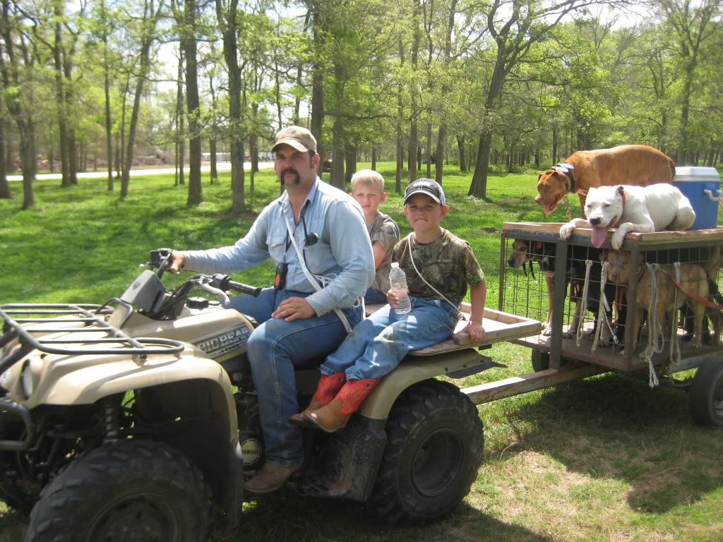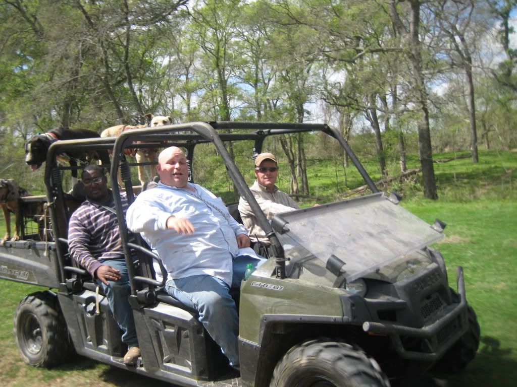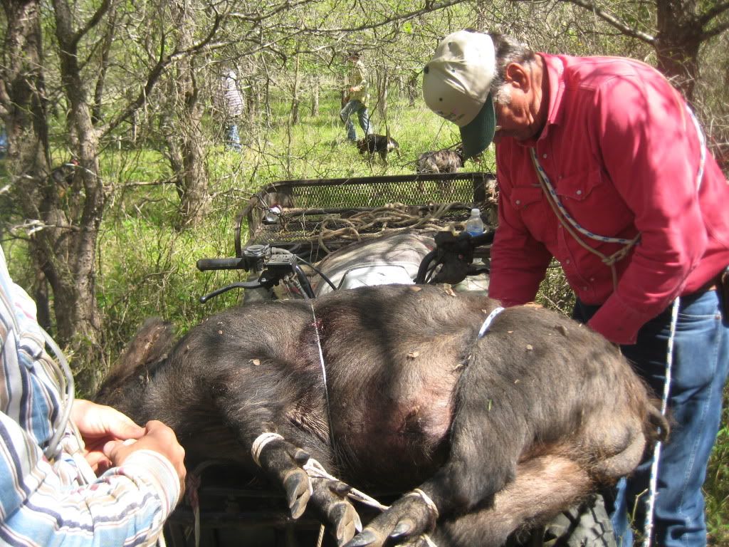 This was one long day for the number we caught. The pigs were all one at a time on this day. Lone boars bedded. Not all that bad though, the guy we were hunting for was happy with what we got. The kids really enjoyed being able to see the dogs catch, and so did I. What Justin didn't mention was how we shut the first boar down. We spotted him way out in a shallow draw, and Cody rolled out around him on his four wheeler. The race was on. The dogs never saw the hog until it was too late so Cody kept pushing him towards us. This pig was gettin it too. He looked as though he just stole something. After a pretty good run by the pig and myself driving like a maniac to get ahead of him I turned out three of my dogs. Well I turned out two and the third busted the snap when she saw what we were chasing. Those three grabed some hind parts