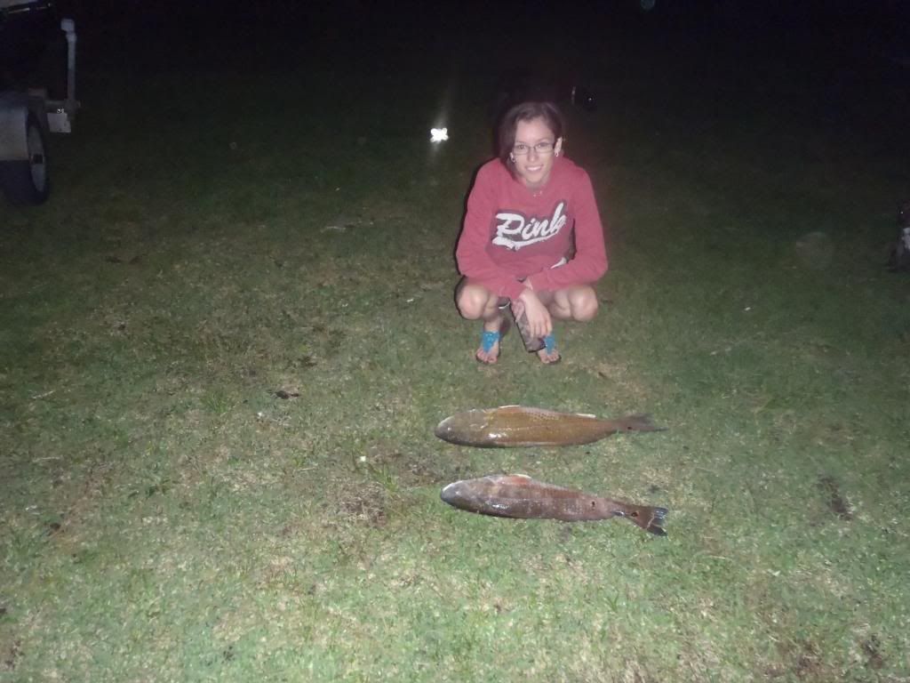 Its been over a year since she has been fishing due to the baby and all. She did well though. She caught two reds that were over the slot size and two that were keepers 27" and 24". Over sized  The two we kept for dinner