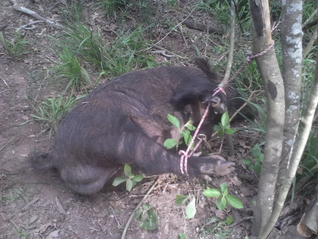 The dogs ran this nice young boar non stop for 4 hours before he sat up and bayed ! Had some good teeth for 168 pounds.