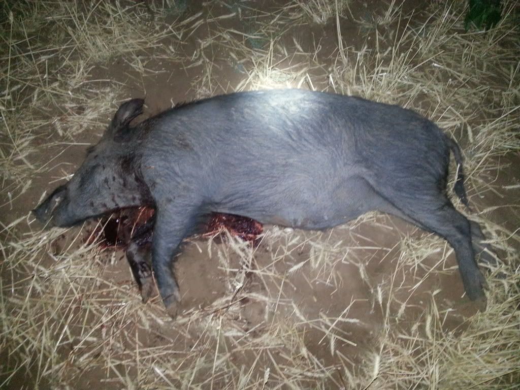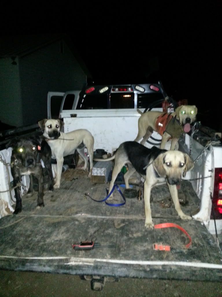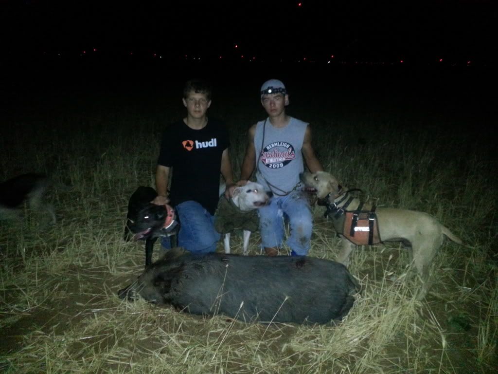 Me, Scott, and Colter loaded dogs up around 10:30 and went to go hit some wheat fields we dropped the tail gate but left the dogs in to wind, scotts Hyde dog started getting real ansy so we stopped and yipped them down, they ran infront of the truck and bolted right across the wheat, about 20 seconds later Hyde sounds off and the others behind him, the hogs start grunting and we head in with Boston scotts cd, we get about 100 yds away and kick him loose I run in behind him and he latches on the sow, these hogs have never encountered a dog before because the group would not budge even with boston hangin on a sows ear in the very middle of the group, I got all there attention enough for scott to grab a leg once he did we flipped her and stuck her. We coulda kept on the group once they ran but we both had work in the mornin so just caught the dogs and headed home.