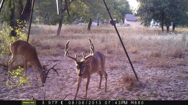 Got my new Moultrie M-880 trail cam in and set it up at my buddies house right down the street. He has a feeder throwing corn about 50 yards from his back porch. He's been braggin about a HUGE 8 pointer but he had no pics to back it up. So, I set my new camera up and presto, I'd say he's a big boy alright.