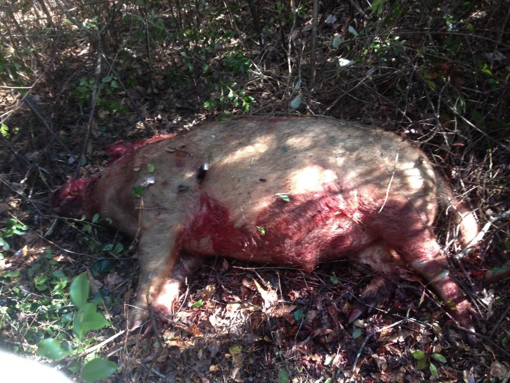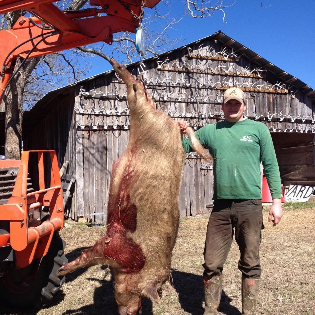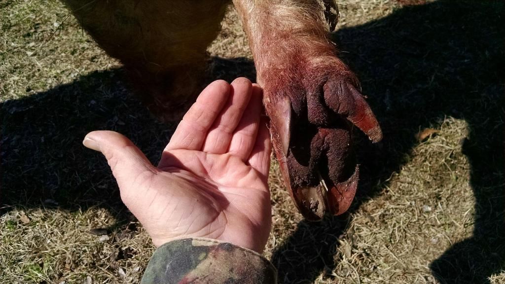 I figured since it's cold and raining out and not much else to do I'd share a hunt I had 2 weeks ago. Got a call from a chicken farmer that a couple hogs were rooting up the ground around his chicken houses. I didn't have much else to do so I loaded up a pair of dogs (Phil, Axman)and a bulldog (Mo)to check things out. Got to the farm at daylight and talked to the farmer about where he thought the hogs were at, what size, and how many. He said there were just a couple and that he didn't think they were too big. There wasn't any fresh sign around the chicken houses or in the pasture. Everything had been rained in a few days earlier, so I made a cast. The dogs hunted a ridge about 500yds and turned due west and preceded to go straight towards a pasture full of cows. My dogs love to herd and chase cows which isn't a good thing. I attempted to run up a powerline to cut them off but that was short lived. I managed to bury my wheeler and had to run about 0.6 miles to capture those two heathens which had about 50 head packed tight. Running that far is one thing but with water filled boots and 30degrees it was about more than I wanted. I managed to get back to where I was supposed to be and found the farmer and asked if he could give me a pull with his tractor. After all of that I debated hanging it up and calling it a day. I decided to make a loop all the way around the pasture and see if there was a trail anywhere. I found a small trail and walked about 50 yards outside the pasture and looked down to find the biggest hog track I've ever seen. I walked a little further and found some fresher sign. I put Axman and Phil down and they proceeded to beat the bushes. I sent my brother a message to say a little prayer for the dogs and I. I had a feeling I might need it. The dogs separated and Axman came back to within 375yds and showed treed. I listened for a squeal but heard nothing. Axman is as rough as I've ever been around. After 30/45 seconds I heard Axman squeal out. He's done that a few times and it's always when he has more than he wants. I turned Mo down and started attempted to run towards the action but it was super thick. Vine wraps, saplings, and bamboo briars. It took Phil about 3 min to cover Axman and when he got there they made the hog start squealing pretty good. Mo started heading that way but it didn't last but a minute or so and Phil started baying. When I get within about 75 yards all goes quiet. Then bushes start shaking and Mo starts whining caught. Mo managed to catch him across the top of the nose and I got in there pretty quick to find a whole lotta hog! When I grabbed his back leg I knew he was as big as I've laid hands on. Phil got there and the three of us gave ol bigun the Whatfor. There was no way I could've tied him up by myself. A knife was my only option. As things calmed down and the hog was almost dead all I could think was Axman had seen his last. He was nowhere around the hog. My gps showed him treed at 56 yds and I headed that way. After about 50 yards of tearing through the thickness I look at my system and he is 120yds going straight away. By now he has reached a wet nasty stinking bottom. I look down and see a heck of a blood trail. Just like a 2 blade rage had went through something. I hallar out and he stops. When I get to Axman half of everything he has is on the ground. He was worked over mighty bad. I figured that was gonna be it for him. I put his insides back where they were supposed to be and took my shirt off and tied him up. I took my belt and tied his head down to a bay root and went and caught the other dogs up. The hog was caught about 7 and a little after 9 I got axman to the truck and strait to the vet. It was bad on me carrying all 75lbs of dog 350 yds to the nearest place I could get my wheeler across that creek swamp and crossing the creek neck deep. Every time I stooped to rest something else would fall out. I ended up seeing everything he had from the diaphragm back. After going to the vet and tending to the other dogs I had to task of getting the hog out to prove my adventure. A solid hour of work, 375 yards of vine wraps, saplings, bamboo briars, and tearing all the fenders off my wheeler I got him out. A helicopter would've been nice. I got the hog home and weighed and showed off and then headed I to work for a 12 hour night shift. So much for a quick hunt. The hog showed between 388lbs and 392lbs on the scales because of the wind on top of the hill at the barn. Axman is doing pretty good. He'd hunt right now but he's gonna sit up till after turkey season.      Sent from my iPhone using Tapatalk
