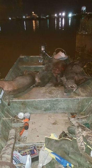 A friend of mine TJ called & invited us to come hunt with him & his buddy Joe. TJ has a contract for killing the hogs off of this 15000 acre island. Big Game Joe & I headed out at 4:00 and it was 27 degrees. By the time we got to TJ's it had warmed up to 32 degrees. Anyway we got started & got over to his hunting spot. Due to some unforeseen boat trouble we did not turn loose until 9:00 am.