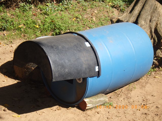 Fixed a couple more dog houses a few days ago they have worked really well for me, they absolutely stay dry and are quite durable, I have some that are at least 8-10 yrs old. Some dogs will chew on the porch a little but have not been successful as I don't have any destroyed. The door is 13 inches from the top radius to the bottom of the doorway, and is 9 inches wide and will allow a big dog (my Dogo) to get in and out easily. This leaves a good deep floor for bedding. The blocks screwed to it just keep it from rolling. The porch is just half a lick tub and is screwed from the inside of the barrel with 5 dry wall screws through the lick tub and a small washer cut from the piece left from the door opening, then ground the sharp end of the screws off on the outside.