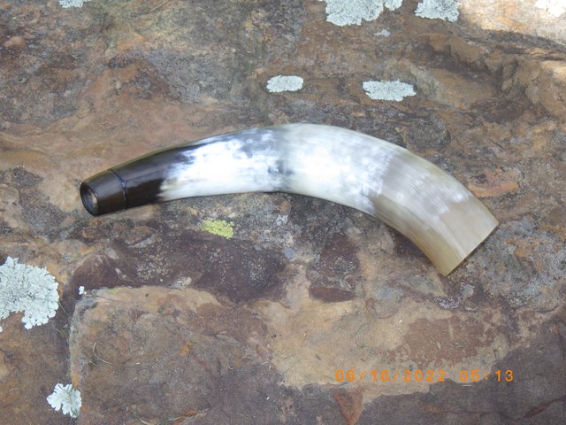 I decided to start using a horn to call my dogs and one day we had penned a big bunch of cattle at some big pens that had a hydraulic chute in them, early in the year they had dehorned a bunch of cows there and I looked around there and found a nice Corriente Cow horn I thought might make a good dog caller. The next day I started fooling with it and was surprised how little time it took me to complete it. Had figured it would take several hours but 2.5 hours later I was finished all but coating it "had to wait for the next time Lisa went to town to get some sealer". It blows really well is quite loud and has good tone, guess I lucked out as I had virtually no experience making one. I cut about 1.5-2 inches off the base and about 3 inches off the tip IT IS ABOUT 13 INCHES LONG
