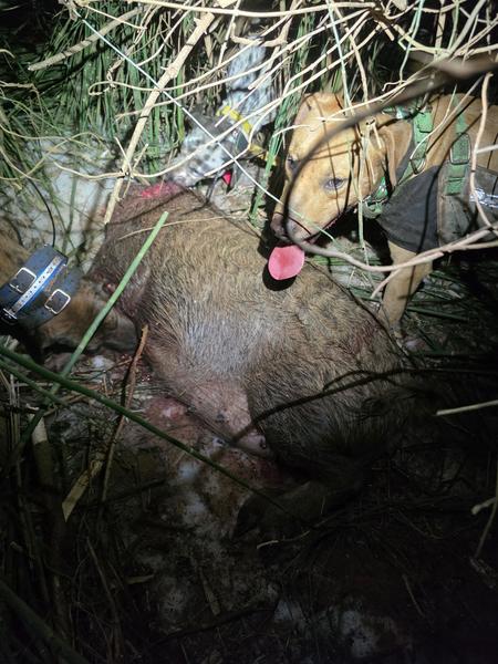 We get closer and can hear the group grabbed up a bacon bit, and the gps showed them split. Three of the dogs, my brindle dog, Dico Dan and my buddies catahoula gyp are carrying the mail. They finally make a stop about 950 yards, at this time the sun is going down. We leave the dogs to finish off the small fry and head to the other dogs, it must’ve took us a half hour to get there and when we did they had the sow in pretty bad shape. We finished her up and started the process of gathering up the remaining dogs and getting to the truck.