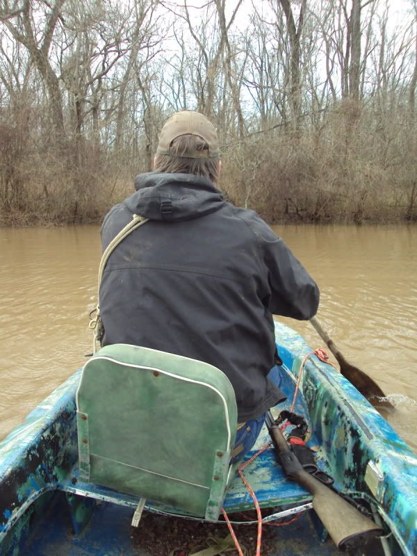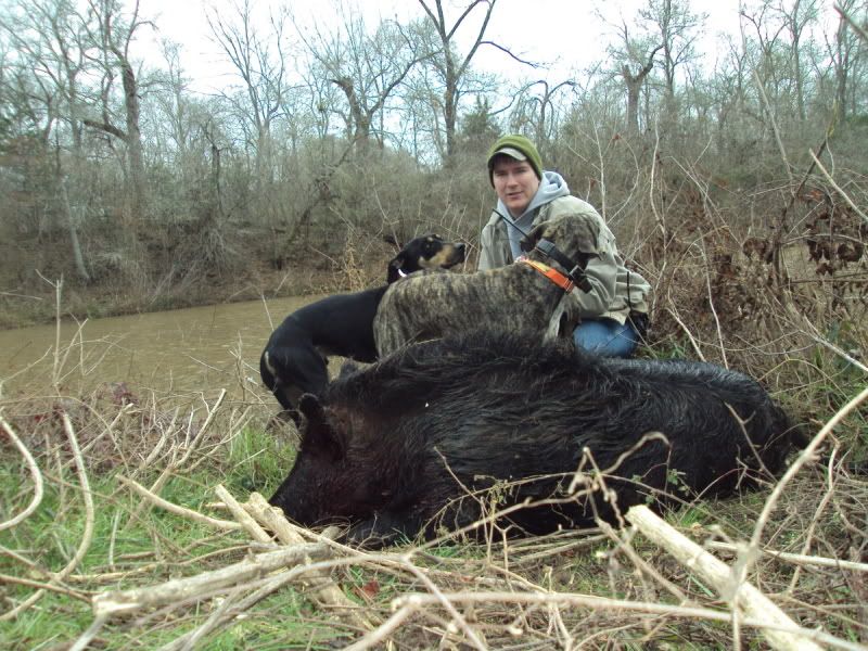 Dad and I made a little hunt on the 8th in the freezing weather. We got started about 10:00 am wtih no reason to start early. Were hunting allong this set of woods that buts up against the Old Brazos with lots of deer feeders and hog sign around. Dad had Monk and a young red gyp allong and I had Joe and Paris. It was cold but not too bad just enough to make you stay moving and in the woods out of the wind. I forgot my 30-30 so I was toting my single shot 22lr from behind my seat. It did'nt take long and the dogs struck some hogs near the river, but were split up, I heard paris open to the left and joe open to the right. The hogs moved a bit and they ended up on one hog which crossed the river. The dogs then bayed him right on the bank on the other side but in brush where I could not see what was going on. Then they must have caught because it got quiet but I did'nt hear any squealing so I figured it was a good hog. I hear some fighting going on and hollar at the dogs so they will back up and bay which they eventually do. Then the hog decides to come back across the river so I got out my camera to take some pictures. Once the hog got close I put up the camera but the hog set up in a brush pile in the middle so I waited for a bit for dad to show up with his 30-30 but he did not show. So then decided to kill the hog and get the dogs out of the cold water. Lets just say ole 22 was not enough gun. I Shot him right below the ear twice and once in the spine and it did not phase him much even though it was not that big of a hog. Needless to say he did not like it and went back across the river. Dad showed up right about this time. So we got a boat went across and dad finished it. Took some more pictures it was a young boar about 150-160 with small teeth. No dogs hurt. I thought about starting a fire to dry and warm the dogs but we just kept hunting instead. They Struck another hog on the top side of the same woods and he ran toward the Old river also. They bayed him on this side luckily we got close and the hog moved a little but still on this side. Ended up the crazy hog was sitting in the water with nothing but his head sticking out and the dogs were baying him from the bank. I guess he figured the cold water was a better option than loosing his manhood to my Joe dog. Dad shot him and joe jumped in the water as the hog sank and swam around then got hung up in some submerged vines. Luckily there was a tree hanging over so I leaned out of it and pulled him to the bank. I took his cut collar of and by the time we walked back to the truck it was frozen. Did'nt get any pictures of this hog because he sank after dad shot him but looked to be another young boar about the same size. Joe got a few nicks but nothing serious. First hog after he started to come back across  The boat without a plug....had to get across fast  Picture of the river from the boat.  First young boar  The dogs from left to right: Joe-Blk and tan, Paris Brindle female, Monk Brindle male on right  Waylon