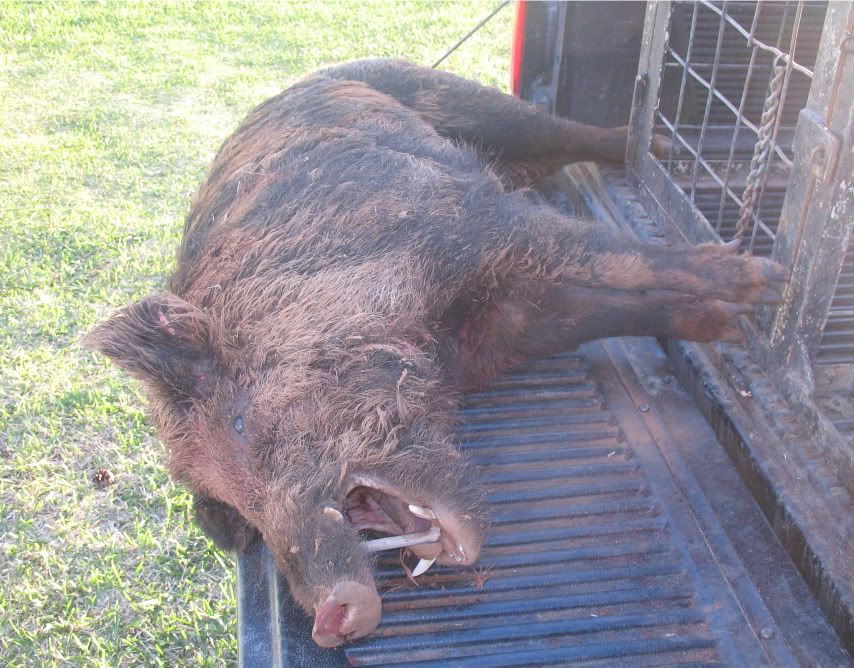 well went hunting last night with my cousin around 11:00 i just took bertha,blue,lady,and big brindel because maverick is in rehab well it didnt take a few min for bertha,blue and my other cousin dogs to start barking they hit a whole group of hogs you could here were they were barking in diffrent place well they finally singal out a good spotted boar but the boar head to a little creek they have there at the ranch thank good its not 2 feet deep got the pups off which lady is one of them. you could hear the nice bay they had turn brindel lose on them whack he caught got that hog stucked. the next boar we killed was in the next field same thing again but this time the dogs stop this boar in the middle of the field turn brindel lose whacked i cant belive this is brindels 3 time in the woods he caught like a pro got the boar stucked and load up the dogs and head home. i gave my cousin one of the boars and i kept the second boar we killed. ( SECOND BOAR)