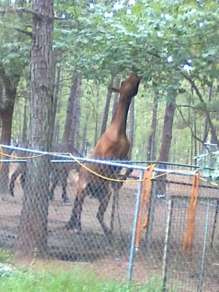 My son hid in our horse trailer trying to catch his old dog breaking out of the pen so he could correct him and got a picture of my molly mule pruning a tree.