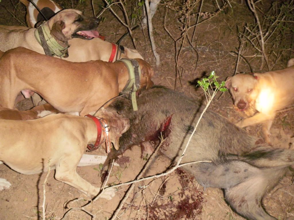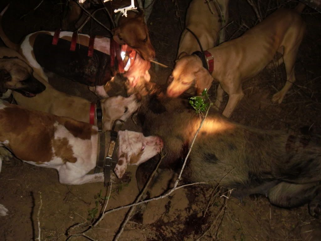 We let the dogs out and had our first bay in 12 minutes, sent the CD's in from 325yds out and they sealed the deal, good sow around 220 or so, really fat. Drove around for a little longer and the dogs caught another sow around 150. A good hunt and no dogs cut.
