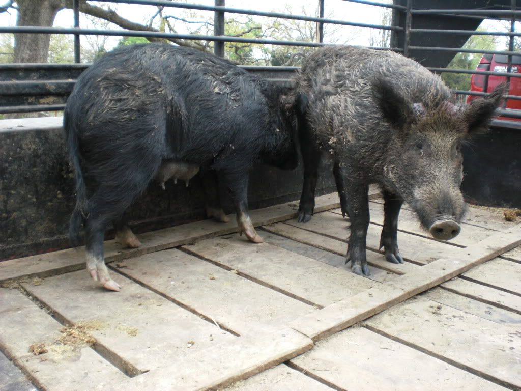 I got a call last week from a buddy who said his boss was begging him to come hunt his deer lease and try to get some hogs run out before next deer season. We dropped the dogs about 6:30 and walked for about 15 minutes into this bottom and there was hog sign everywhere. Red opened up bayed and we went to him and caught a sow that went 145. He rolled out and caught a shoat about 100 yds. away and we let my bmc pups play with it a little since it was there first trip to the woods. Red rolled out from there and went about 150 yds. and struck, and bayed at 400. we went to him and caught a good boar that went 195 with a nasty attitude. All this took less than an hour. Getting the hogs out took a lot longer than that. The sow wasn't too bad, but the boar we had to carry 350 yd. to the 4 wheeler. We cut a sapling and carried him out on it. It was a good hunt and really good for the pups. They are just 7 months old and didn't know what was happening at the first bay but picked it up quick.   My bmc pups with the shoat.