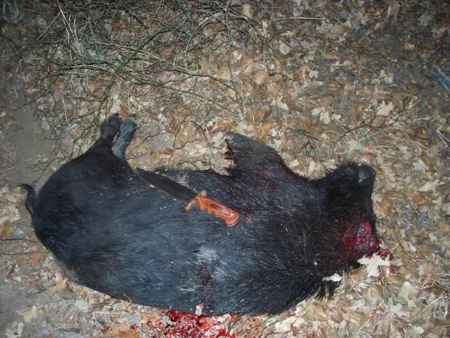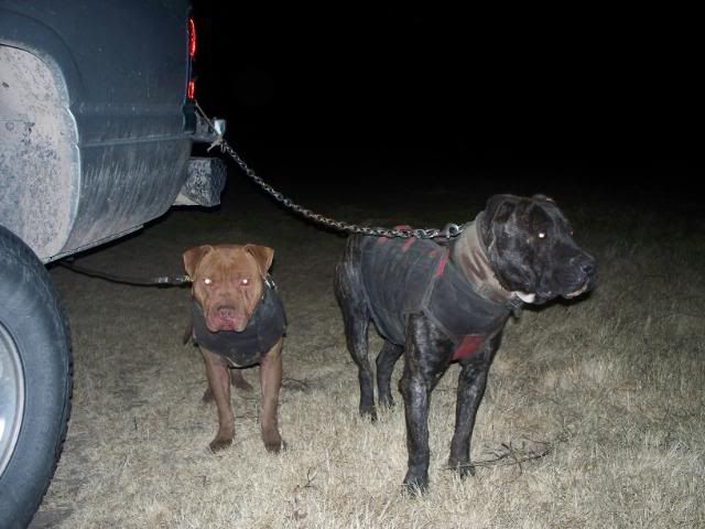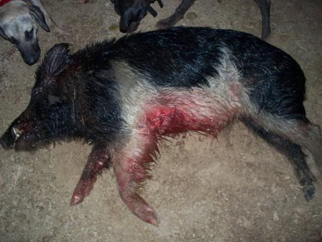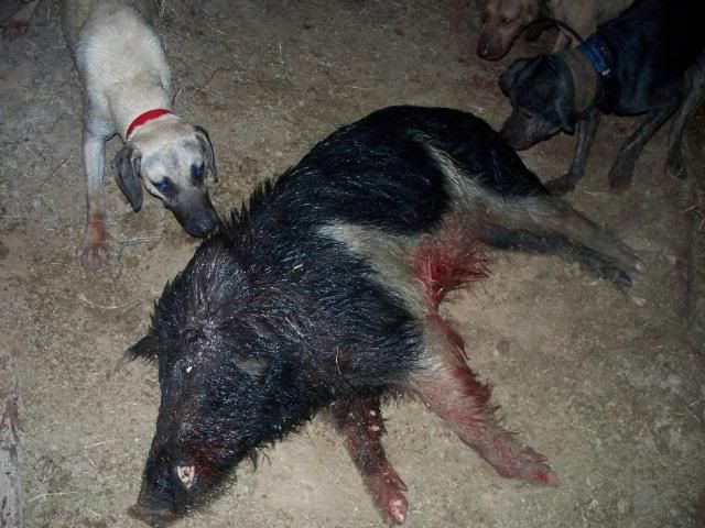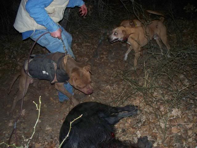 Went out yesterday about 4 miles from my house right at dark and dumped 6 bay dogs out in front of the truck. We had never hunted this particular place but we had caught plenty of hogs about 600 yards down the river. We found a good brush line and followed about 100 yards down before all the dogs started acting real piggy. My Molly dog and Josh's pup Rambler were gone and Brutis and Red were trying to work a track farther down the brush line. After Brutis and Red were in for about 2 minutes every dog that was still there perked up and ran in. We killed the truck and about a minute later one of the dogs ( not sure which one ) opened up. We could tell the pig broke and they bayed him up again twice before they got him to stop and that was a caught hog. We sent the CDs in just for back up and got there and stabbed this boar about 170 lbs with only one cut dog. I got the bay on video and you can see after we stab the pig he gets a hold of Josh's boot in his mouth! lol