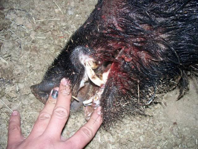 After we left that place we went out of town to one of my Grandpas places and dumped the dogs on a road that ran along a grain field. As soon as they hit the ground they were off and out of sight. About 5 minutes later we heard Josh's Mtn. Cur Tanner open up and then we had a solid bay. We got the CDs and headed across a coastal field to a real deep tank. We sent the CDs in from about 15 yards out and then hauled butt to grab the pig before he could get any deeper. Got him stabbed with only one dog cut suprisingly. Looks to be the same boar that broke bay on us about 3 times last time we hunted there. He was probably a little over 250 with about 3 inches of teeth on one side. Over all great hunt with only 2 cut dogs.
