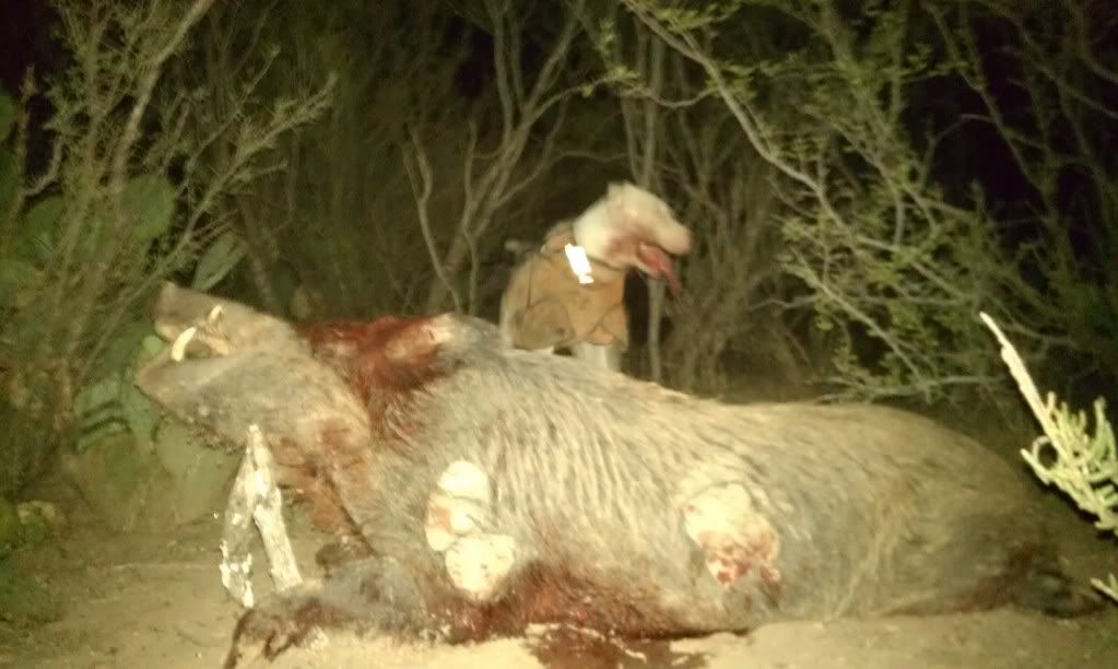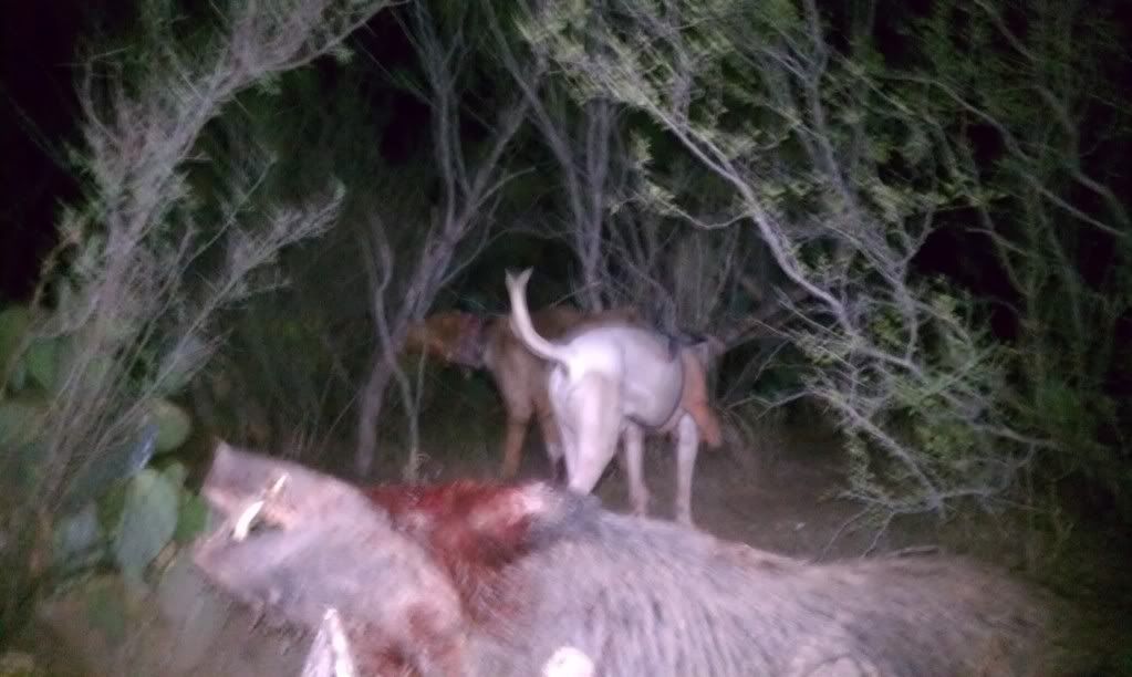 I havent been on in over a year been buzy with work. My username used to be lcurrie but lost that email and info. But i have not quit runnin my dogs i have cut my pack down from six to two dogs leaving me with just shooter (cd dogo) and Boy (strike dog red leopard). I was down at the ranch this past friday down in web county. I took out my dogs at 10:30 pm and drove down alot of senderos and didnt end up seeing anything. so i decided to dump boy out 200 yards from a feeder to see if he can pick something up he took off real fast so i unloaded shooter and started walking when boy started baying up around two hundred yards away. I walked shooter up to the bay to within fifty yards and let him go. Bam shooter smaked this hog sounded like a good wrestling match. So i go ahead and stick this big boar. i didnt realize until little while after that the boar was actually a barr the first boar i had cut on the ranch 4 yrs ago for some reason he was still a rank stinky boar. heres the pic of the 240# boar and the team. it was a nice hunt its been a while since i caught a hog  that i could brag about his cutters he will make a good skull mount.
