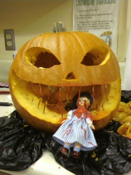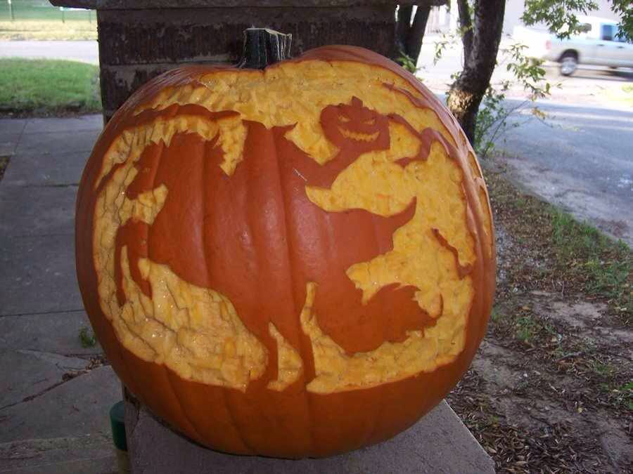 Well the ole lady got.a pumpkin and wants me to carve it but she said she did not want it like.the plain triangle eyes nose and and mouth need some ideas soon thanks