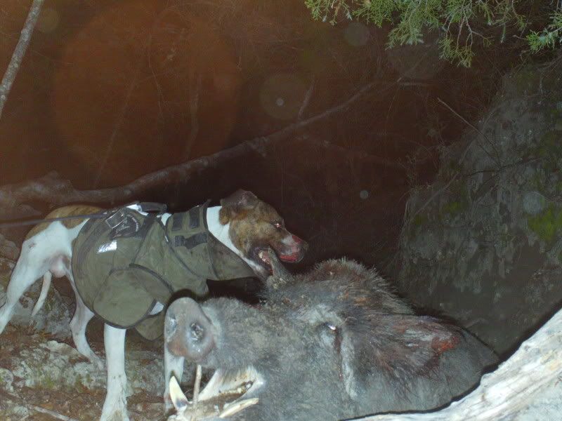 Sunday evening my buddy wanted to hit his protein feeders just before dark. We casted the dogs a few times without any luck. He convinced me to hit one more spot...as I was heading to the house. Making a circle around the small food plot, Bart was hanging his head over the ranger towards the ground. Luke my better winding dog didnt show much. I slowed down and they shot off the ranger and across the small food plot tracking. .75 miles down they were showing bayed on the garmin. I could tell by their excitement he was gonna be a good hog. I was kicking myself in the butt for not bringing both catch dogs. 30 yards away I cut Jack into the bay. The hog was in a small rivine about 5' deep and 5' across...back into a rock ledge. He pitched Jack 3 times that I saw before he made a clean catch. Hog went about 250 lbs and was missing one wetter. That side had a 3" cutter curled back towards his head.
