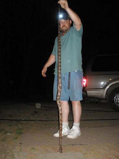 Our friends, the Holubs invited to hunt with them Sunday morning, Got a decent boar hog, and another smaller boar about 95 lbs.  later that evening while Thomas was feeding the dogs, there was some commotion in the chicken coop, He found this creepy critter with a mouthful of my blue cochin, and had alread swallowed some eggs she was setting.  needless to say he was recycled into the hog pen.