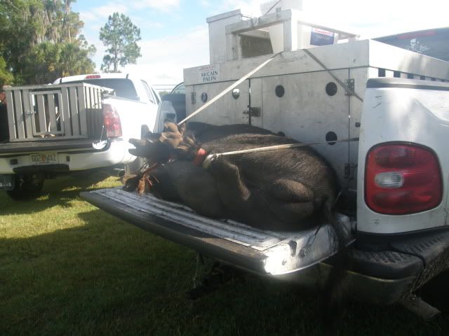 With all the rain we have been having the temp wasn't bad so we went hunting in Ormond Beach last sat. night and caught a 40 pound gilt and turned her loose and then around two in the morning we saw tracks in the road and put out on this boy and bayed him in about 20 minutes. I was going to bring my video camera but we had to cross water and being only 5' I have a tendency to get really wet, so I just brought the hobbles and light. When the dogs caught him, the guys grabbed his hind legs and told me to help flip him, he was in between some pine trees and had dog hanging on him. so i grabbed his front leg and pulled to no avail and then Terry told me to push him over, and the hog was biting the CD foot, as soon as he was flipped over the poor dog turned loose of the ear and begin to chew on the hogs mouth. I felt sorry for the dog but I was not going to stick my hand near their.  Anyway, he did not get bit to bad. We tied him to the tree until morning, so we could hunt the rest of the night. We got on another one but she ran into some private land, which we can not hunt, so it was a pig day for her. this was the first time in 6 weeks we have been hunting, hopefully the rain will keep coming and the cool nights.