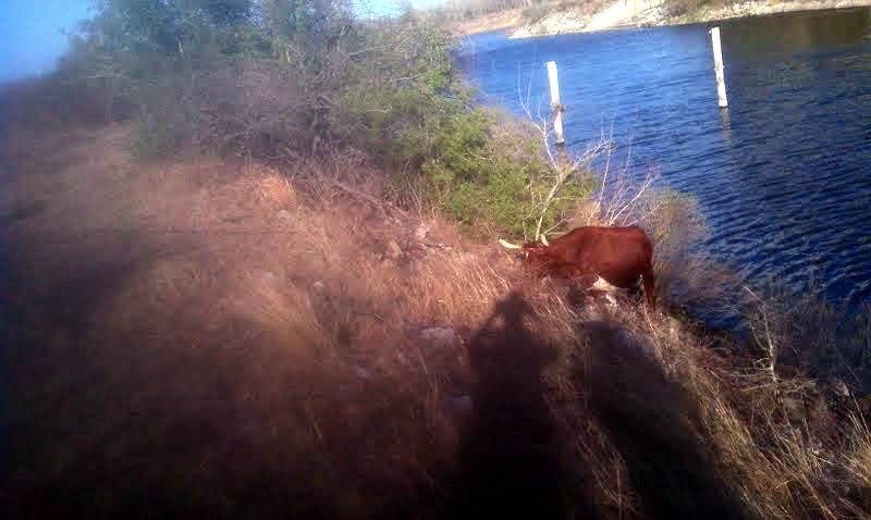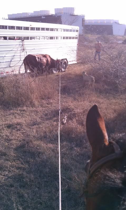 That was Mandi taking the pics. We had her bring the truck around to the canal so we could load the cow, and I asked her to get some pics. I am pretty sure Tyson will be involved when we go back for the brangus. Let the dogs bay her up, then we'll send in Tyson. I have a feeling she's going to be coming out of the brush once he gets ahold. The pics are blurry because Mandi's phone camera busted, and now the pics look like hell.