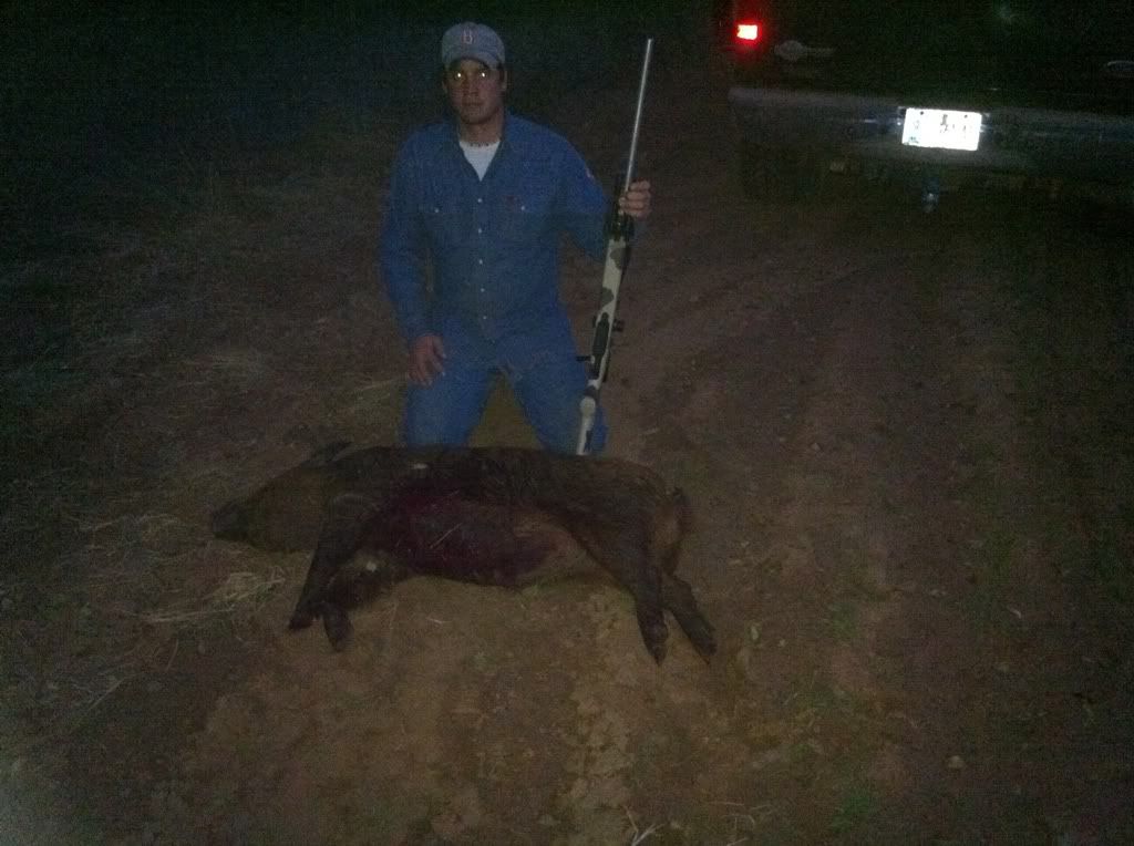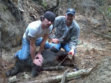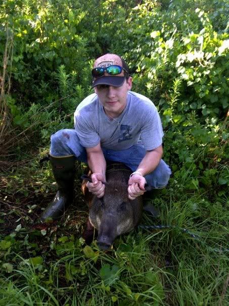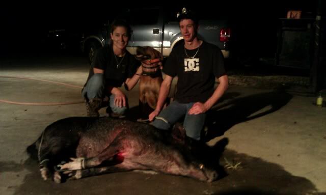 Clint and my fiance Chelsea with a little boar hog we caught.