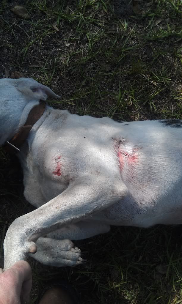 I agree a lot with whats been said here. But to Barney time things a bit or put things into what some call layman terms, medications used for any process is so simplistic it's complicated. You wouldnt put yourself on a morphine drip because you got stitches would you? Well granted some would take the meds just to take'em but better yet you wouldn't use a shot gun to kill a bee hive! The indications and contraindications of medications are only useful if the side effects don't over exuberate the fixing of the symptomatic therapy that they are being used for. Penicillian is good but what happens when the infection takes over and the pooch developes pneumonia? Given the dog is most likely already severly dehydrated but once you fill that dog up with IV fluids he's going to drowned... Literally! So take things slow, everyone is always so excited to get there pups back in the game but allow them to heal on natures time. Unless the dog had developed some serious trauma, there should be no use of steroids or any other meds thats you wouldn't be willing to use on yourself. Every medication I've ever used on a dog was and is intended for human usage. But what irkes me the most is when people use staples as a way to close an injury, especially not knowing how deep the wound actually penitrates. Staples are ONLY for superficial use knowing that the skin has not been damaged past the 3rd layer. I've had guys bring dogs to my house because they stapled wounds closed that were way deeper than they thought; infection had taken over and the infection had actually tracked the wound 2x deeper than what the wound originally was. Believe it or not, a wound is already infected at the time of injury. It takes time for specific symptoms to show. Use common sense gentleman, why close a infected wound? Some of the largest wounds on humans are always open, allowing the body to heal from the inside out. With clean irrigation, proper antibiotics and adequate healing time, you or your pups will be back on your feet before you know it. Healing is a process, it is time consuming but it's only right by you to give your dogs that time to re-coup. Good luck on your next hunt and if you have any questions feel free to ask. Robert aka 'Doc' Edwards Rusty Knife Kennel Kapolei, Oahu, Hawaii