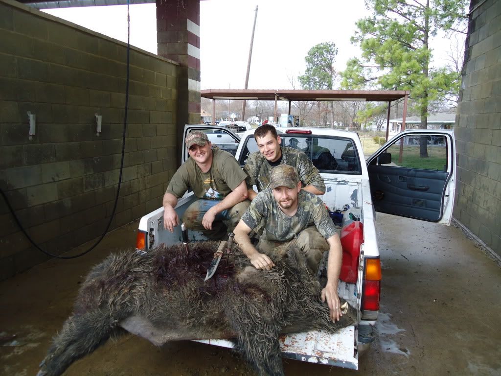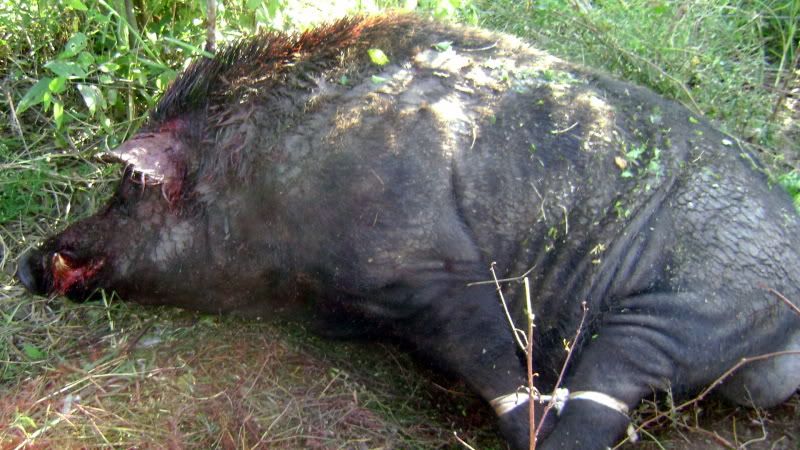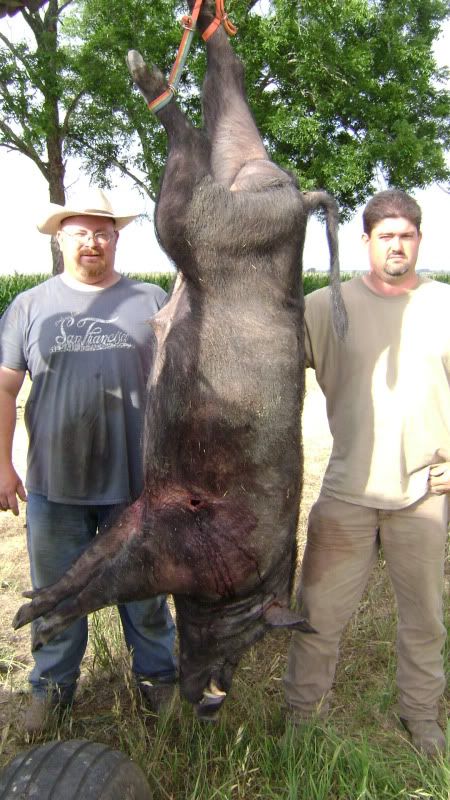 Oficially weighed and scored.  No trickery just a photo of the hog.  This is right up there at the upper limit of how big hogs can get in the wild.  Stories of 500 and 600 lbers are almost certainly bogus for sure..............Or a domestic hog.