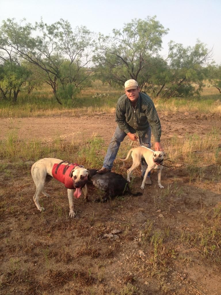 He is 4years old and suppose to be a one out type dog, he hunts short rang and will wind or take hot track and catch, so far he has been kinda slow but he hasnt been hunted in 8months and is a little out shape. I have hunted him twice the first time we didn't get in anything and the second time Tuff and Penny struck and he went to Tuff who had caught a shoat and then they both went to penny who had about a 100lbs sow bayed up about 300yds off.
