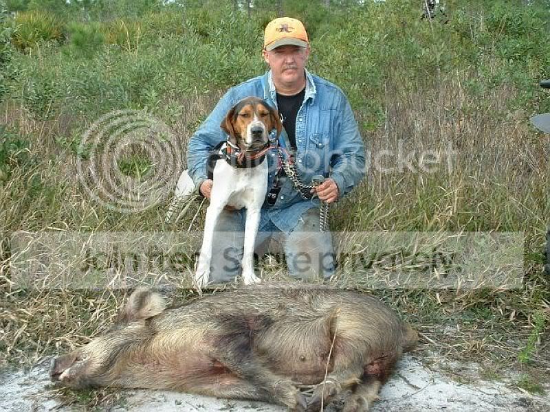 Human aggressive dogs?? Hell, ALL of mine are that way....  I don't think I have a dog on the yard that won't bite a stranger. It doesn't bother me at all. Lots of these Fla dogs are that way , it doesn't prevent them from making good hog dogs. Course, if you are hunting with me, the dogs are fine. You just can't come in the yard or handle one in the box or truck. Once in the woods anyone can pretty much handle them, so its never been an issue for me. BoxR, you would have liked the Walker I had. He has Houses Lipper show up 5 times in his pedigree and he would catch a hog less than 100 lbs or so by himself and catch any hog with a cur dog. Here is a pic of him at 10 months with a hog he trailed up, jumped and bayed by himself. Caught with him and my Monkey dog.