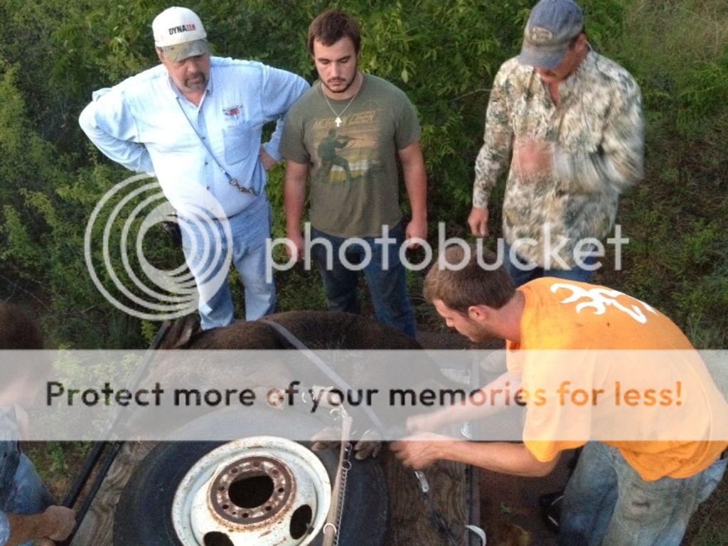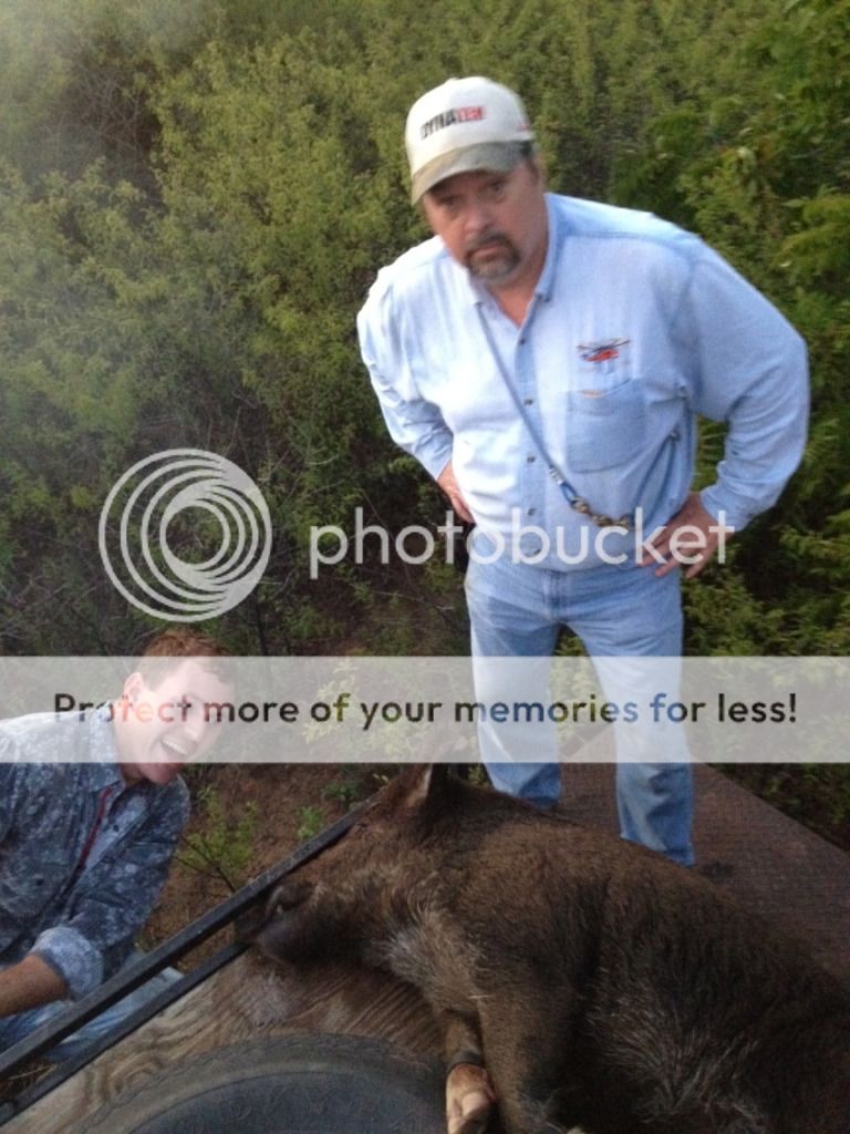 Got a call from a buddy the other day, said he had some fresh pig rootin in the pasture after the rain. Called up olddogger, James White, to see if he wanted to run over there with me. My buddies Nate, and Shane White, olddoggers son, came along as well. We took Lacy, Floyd, and Shanes cat Tank. Catch dogs were Remi and olddoggers dogo Woodrow. Dropped the dogs at the creek and drove around to the rootin area. Dogs winded and all took off, came bayed about 500 yards out in the brush out in a plumb thicket. Drove up to the wood line and walked from there. Woodrow is a beast at about 110 lbs and he went in and slammed this young boar. Cary, the ranch manager, got there just in time to help us load