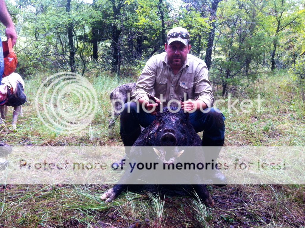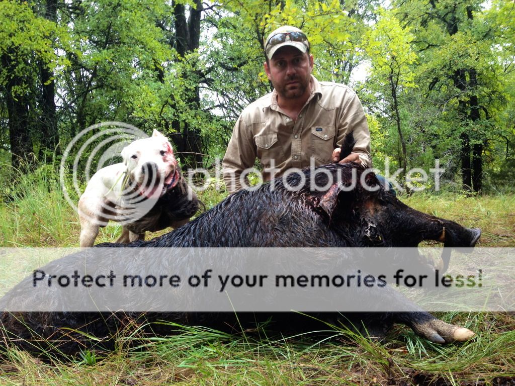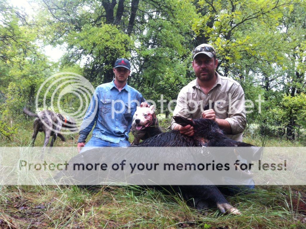 Was hunting a place three weeks ago and, long story short, the deuce got out before we got a chance to gear him up, so I grabbed ginny and hauled but without gearing her up either. My Ginny dog, a young up and coming dogo I had, was killed by the boar we got on. Deuce had him caught for about ten min, I sent ginny and heard the hit, the boar tossed him when I was almost there and deuce could barely get up. After deuce rolled out in front of me, I look to the right and the boar just walked away with my cur dogs circling him and wearing him out. Look the the left and ginny was laying there, still alive but not good. I carried her out and was able to talk deuce into walking out and I got them to the vet. My buddy went back to shoot him three hours later while I was still at the vet, the boar caught wind of him, broke and wrecked lacy and floyd on the way out. Deuce finally healed up enough to go back out, so we went after him this sunday. Struck him in the same place we did the time before. He walk and walked and walked on the cur dogs. It was a muddy mess so we couldn't get anywhere in the truck very fast, but he finally bayed up (big mistake) and we were able to drive up to about 600 yards. We mad our way there and my buddy who was trying to get some film busted the bay. He ran about 100 yards and then just kept on walking. We tried to keep up to lead the cd's in, but he was pulling away from us, so we cut them when he was a little over 150 yards away. We hauled butt behind them and got him legged and rolled. Got the dogs off and I made sure he had teeth on both sides. He did, so I stuck him (probable my first this year) and Im going to mount him. He was off the 300 lbs scale that we hung him on, but I am guessing him around 320 lbs. I wish we would have taken a bunch more (better) pictures but we were all hung over from the night before (went out with some buddies that came into town for the hunt *DUMB!*) and were just ready to get out of there after the chase. Sean and the boar with Deuce  Me and Sean  Sean  Me  Deuce    RIP Ginny