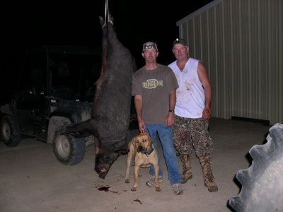 Was out last one night made a dirt road pass on a place earlier that night and was on the way home and decided why not it was on the way so we went back down. Only had one catch dog that night and took out two of my youth. Well the dogs threw there noses up and bailed so i parked the truck. I got out the catch dog. Didnt take but 2 or 3 min and the two bay dogs had this thing stopped in its tracks. I like to get within 100 yards before i let the catch go. We did and then took off after it. When i ran around the corner i saw this beast tossing my catch dog like he was nothing. I tried and tried to grab a leg but every time i got close he spun right at me. Big dude. finally the ear tore and the catch dog was thrown off. When he went to grap he got gutted way back under the vest. Bum luck. as he was running in he got caught on a tree and it twisted him around. Thats why the hog hit him there. I had to shoot him that night. My two dogs didnt let him get but 20 feet away and bay him up again. So i grabbed my kimber 45 and put one right in his head and he dropped. Came out at 398 on the scales the next morning. I loved catching him but would rather not and kept my catch dog. He was a great dog.