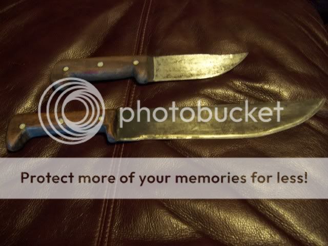 heres my knives i hunt with they are cheap cheap ,,,, I use the cheap machettes you find at flea markets and pawn shops,, with the wooden handles that have the stamp "TRAMONTINA BRASIL" I first rip it down to the thickness i want ripping off the back ,, then i have templates I made of blades i like and make them out and cut them out with a grinder or a saw with a composite metal cutting blade you can get a lowes or even wall world (make sure you wear your eye wear) , then i go to the grinder and work the cutting edge (SLOWLY) DONT OVER HEAT THE BLADE OR IT WILL LOSE ITS TEMPER,,,, after that i take a file and smooth it out and perfect the edge with a make shift lansky clamp and then i sharpen on a stone that i cut on my brick saw out of luders stone... i can do a couple in about 2 hours goofing off and haveing a cold refreshment they are strong stay sharp andare real thin for the size. the blade on the large is 10 3/8,, the small is 5 1/4 . aww heck heres a couple pictures Dexter