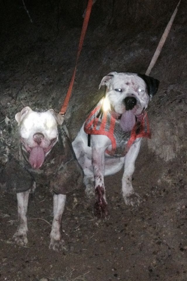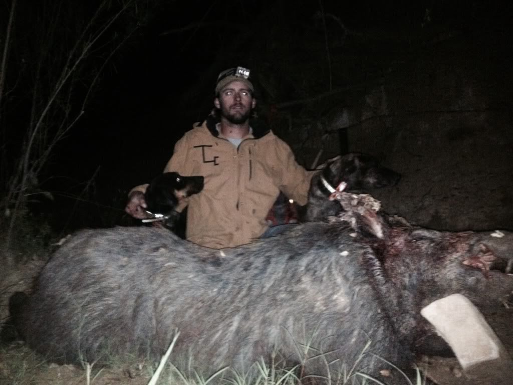 Well me was at my buddy ranch we pull up to one feeder there a little sign dogs roll out come up with nothing we were gonna stop at one more feeder before we picked up and went home well this feeder had real fresh sign dogs went straight to bout 220 and sat down killed the ranger and bingo we got him bayed solid slip in there to 40 yard send the Calvary and he put a whoopin on em broke for bout 100 then caught hog and I put a whoopin on him! Me  My good friend Seth  And of coarse the Calvary Dutch on the left sarge on the right