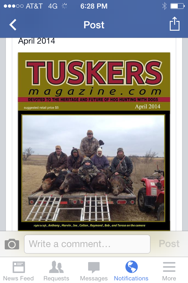 Tuskers magazine took a exciting action packed story I sent in and put us on the front cover for April , just some old red neck boys from Oklahoma , thank you Ed Barnes , we are truly honored , get you guy a magazine , it's a great read for hog hunters TEAM HHH GETTING IT DONE